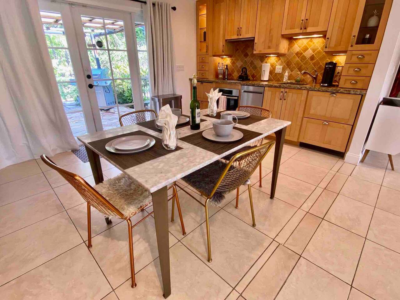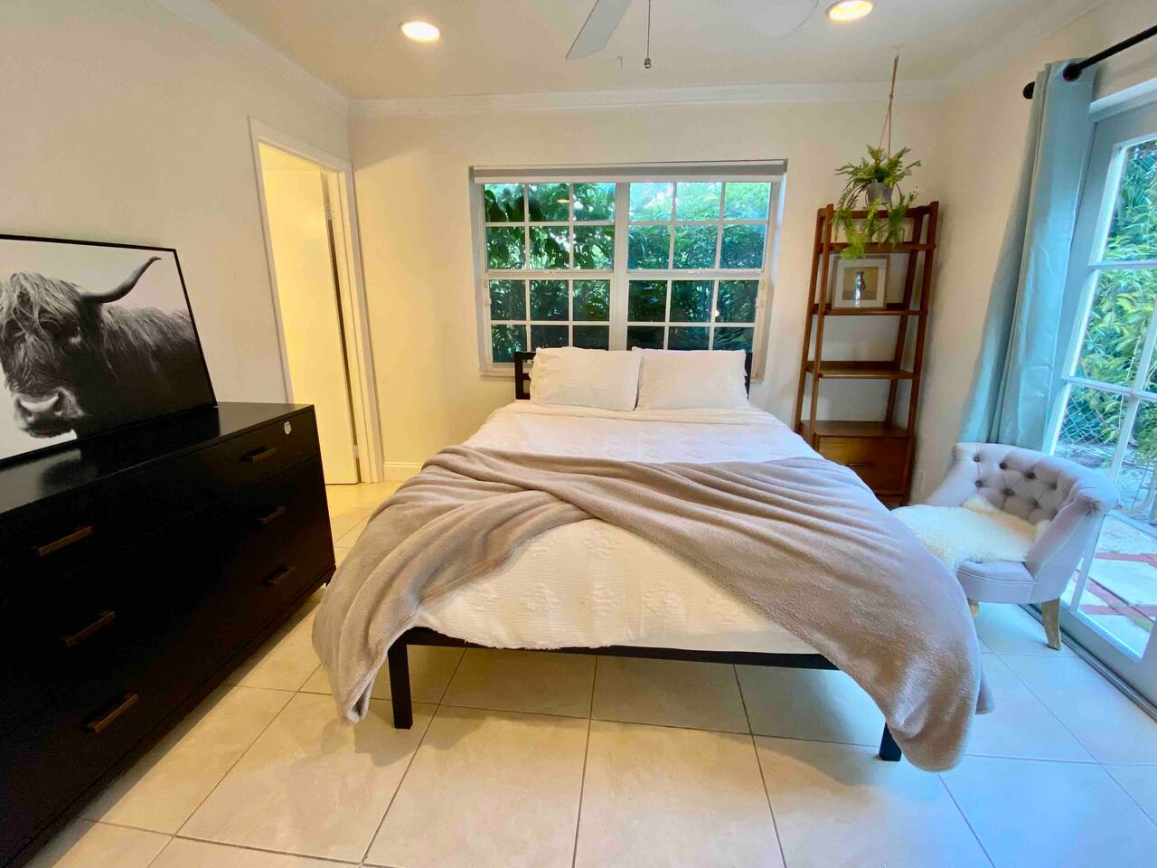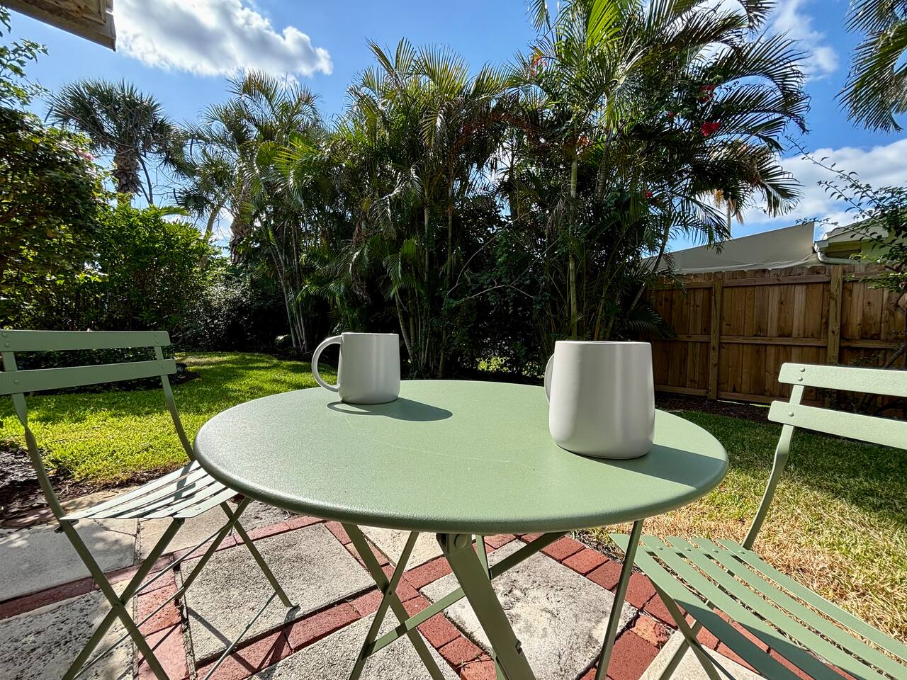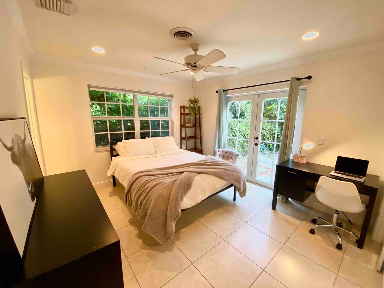 This home is located in a quiet residential neighborhood of Pineapple Grove close to Downtown Delray Beach. It is a duplex property, and you are privately staying in the larger front unit with a private entry and a large, fenced backyard. The entire unit is comprised of two bedrooms, two bathrooms, open concept living & dining plus kitchen, French doors to the back patio off of kitchen as well as off of the second bedroom which has an en-suite full bath with a tub. In the hallway, there is a beautifully remodeled full bath with a rain shower system. Right across the hallway is a massive primary bedroom with a queen bed & a twin + trundle bed perfect for the whole nuclear family. The entire home is equipped with ample dressers and closets, beach towels, outdoor furniture, games, fully stocked kitchen with Nespresso machine + capsules.